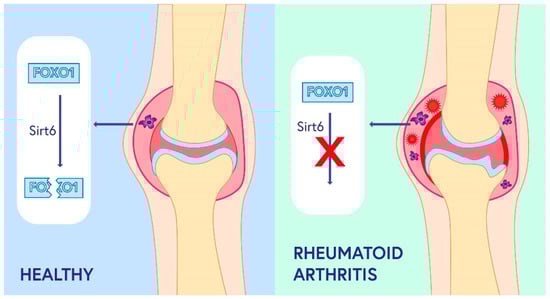 Sirtuin 6 influences a number of processes that may be involved in the development of RA. SIRT6 is involved in fatty acid metabolism and influences the secretion of TNF-α, a cytokine that plays a key role in RA pathogenesis; moreover, SIRT6 modulates NF-κB-related metabolic pathways [58]. A number of pro-inflammatory mediators regulated by NF-κB are involved in the pathogenesis of RA. SIRT6 exhibits anti-inflammatory effects by inhibiting NF-κB-dependent pathways. This was confirmed in mice with induced arthritis, in which administration of SIRT6 resulted in reduced inflammation and decreased secretion of pro-inflammatory cytokines [26]. Moreover, it was shown that SIRT6 inhibited osteoclast differentiation induced by GM-CSF (granulocyte-macrophage colony-stimulating factor) and RANKL (receptor activator of nuclear factor kappa-B ligand) [59]. These results suggest that blocking the NF-κB pathways by SIRT6 in rheumatoid arthritis reduces both the inflammatory response and leads to a reduction in joint destruction. Moreover, myeloid SIRT6 deficiency has been shown to affect the development and exacerbation of RA in mice by increasing the migratory potential of macrophages [27]. In healthy joints, SIRT6 deacetylates FOXO1, leading to its transport to cytoplasm and degradation [60]. In RA patients, deacetylation of FOXO1 by SIRT6 in macrophages is impaired, resulting in the activation of immune cells, increased inflammation, and tissue destruction [27] (Figure 2). Zhang et al. showed that SIRT6 in RA-fibroblast-like synoviocytes suppresses cell proliferation and inflammation and induces apoptosis, thereby alleviating RA symptoms [61].