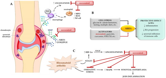 Prevention role of resveratrol in rheumatoid arthritis. (A) The pathophysiological mechanism of rheumatoid arthritis (RA) controlled by environmental factors, gene interactions, and the immune cells response, (B) SIRT1 activating factors and its protective effects in RA, (C) Resveratrol’s role in counteracting RA development. Abbreviations: COX2, cyclooxygenase 2; IL, interleukin; TNFα, tumor necrosis factor alfa; MMP, metalloproteinases; MPO, myeloperoxidase; NF-κB, nuclear factor kappa B; PGE prostaglandin E; ROS, reactive oxygen species; VEGF, vascular endothelial growth factor; SIRT1, sirtuin 1; MAPK, mitogen-activated protein kinases; HIF-1α, hypoxia-inducible factor 1-alpha; STAT3, signal transducer and activator of transcription 3; Th1, T helper cells.