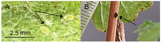 - Lenz, M.S.; Isaacs, R.; Flore, J.A.; Howell, G.S. Vegetative growth responses of Pinot gris (Vitis vinifera L.) grapevines to infestation by potato leafhoppers (Empoasca fabae Harris). Amer. J. Enol. Viticult. 2009, 60, 130–137. [Google Scholar] [CrossRef]