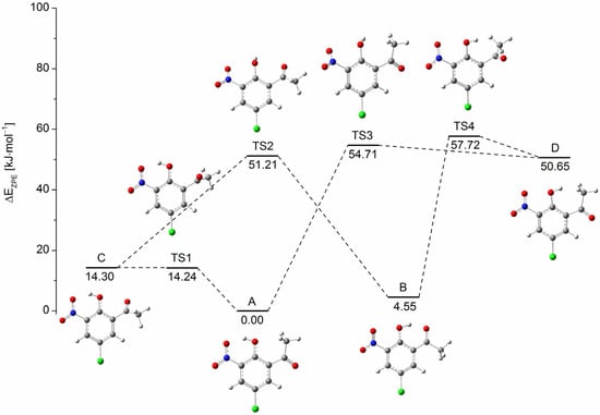 The obtained experimental data proved that the studied compound exists in several conformational states under argon matrix isolation. In order to define the structures of the conformers, DFT calculations (B3LYP/6-311++G(3df,3pd)) were performed that revealed the presence of four stable conformers (A–D) of the studied compound. The transition states joining the energy minima on the S0 PES were optimized at the same level of theory allowing us to estimate energy barriers between the conformers. The ZPE-corrected potential energy diagram for the interconversions of CNK is shown in Figure 1. Conformer A with an OH⋯ONO intramolecular hydrogen bond is the most stable one, meanwhile conformer B with an OH⋯O=C intramolecular hydrogen bond has only slightly higher energy (energy difference of ΔEAB = 4.55 kJ mol−1). Conformer C, which is also OH⋯ONO bonded and has the turned acetyl group, is less stable than conformer A by 14.30 kJ mol−1. It is notable that all three conformers mentioned above contain an intramolecular hydrogen bond, which strengthens their stability as compared with conformer D, characterized by the highest energy and the absence of a hydrogen bond. The energy difference between conformers A and D is large and equals ΔEAD = 50.65 kJ mol−1. The obtained values suggest that the two most stable conformers, i.e., A and B, are likely to be detected in the gas phase as well as in low-temperature matrices after deposition. It can also be assumed that under the conditions of low-temperature matrix isolation, without the influence of external radiation, conformers C and D can hardly be observed.