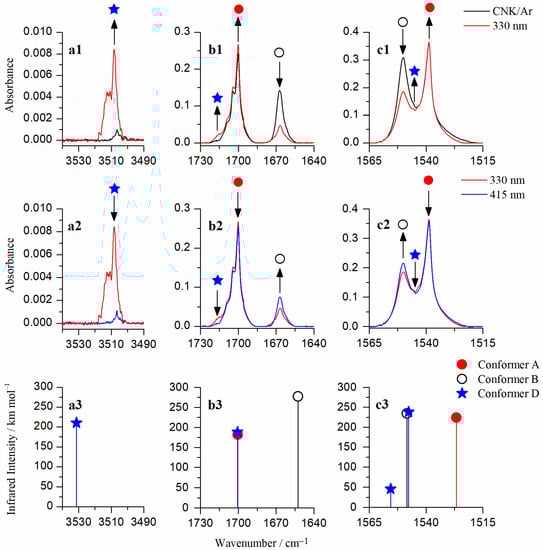 A careful examination of the ν(C=O) range of the spectrum obtained upon irradiation at 330 nm reveals the appearance of a new band at ca. 1715 cm−1 (blue star in panel b1, Figure 2). According to the DFT calculations, this band is assigned to the stretching vibration of the carbonyl group (ν(C=O)) which is not involved in a hydrogen bond. This assignment is approved by an analysis of the 3550–3480 cm−1 spectral region. In this region, a new band appears at higher wavenumbers at 3508.5 cm−1, which is assigned to the ν(OH) stretching vibration of the non-hydrogen bonded hydroxyl group (Figure 2, red trace in panel a1). This spectral pattern corresponds well to the theoretically predicted spectrum of conformer D, confirming that this structure is formed in the CNK/Ar matrix upon irradiation at 330 nm. It was not observed in the spectra obtained directly after deposition due to a significant difference in energies between form D and the most stable form A as well as a high energy barrier for their interconversion (ΔEAD = 54.71 kJ mol−1 on the S0 potential energy surface, see Figure 1). The appearance of conformer D becomes possible upon the electronic excitation of conformer B at 330 nm.