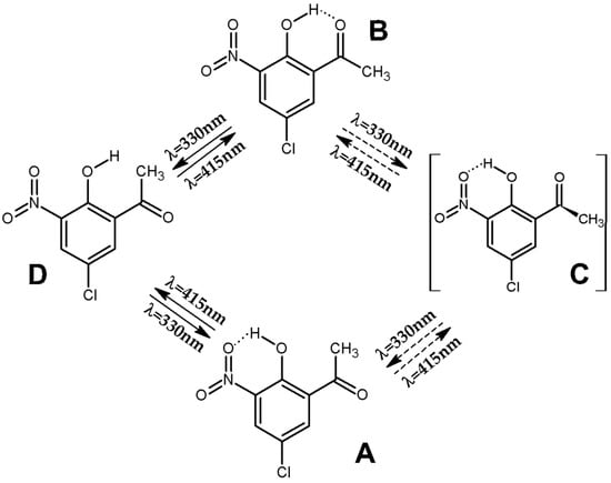 Diagram of photoisomerization processes in 5-chloro-3-nitro-2-hydroxyacetophenone (CNK) upon irradiation at 330 and 415 nm.