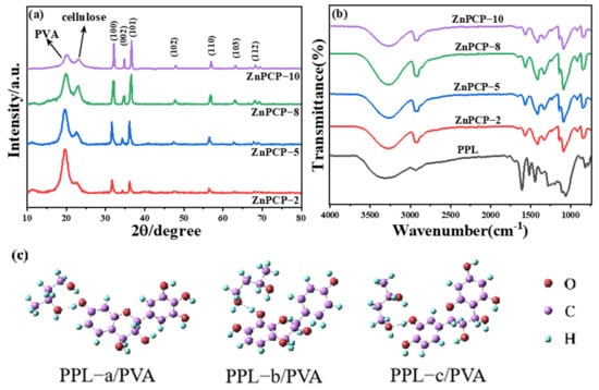 (a) XRD patterns of ZnPCP; (b) FT−IR spectra of ZnPCP and PPL extract; and (c) optimized structures for PPL/PVA isomers.