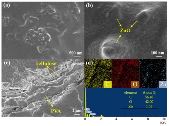 SEM images were taken to further explore the morphology of ZnPCP−10. From Figure 2, one can see that both cellulose and ZnO were dispersed in the PVA film. The particle size of covered ZnO was about 1 μm. The cross-section SEM image of ZnPCP film shows that the cellulose on the PVA was 1 μm wide, which would enhance the mechanical strength of the film. The EDS images in Figure 2d provide evidence for the existence of C, O and Zn elements in the composite, while the ZnO content was calculated to be about 8.6%.