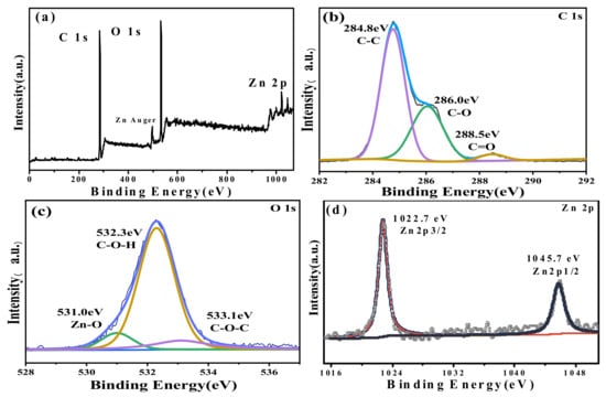 XPS spectra of ZnPCP−10, including (a) survey, (b) C 1s, (c) O 1s and (d) Zn 2p.