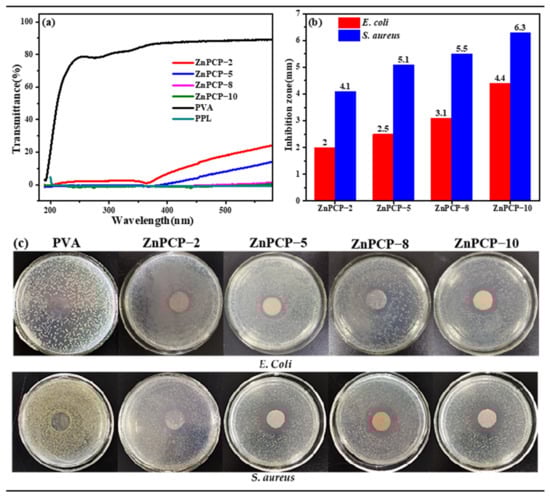 (a) UV transmittance of PVA, PPL and ZnPCP films with different mass fractions and (b,c) antibacterial effect of ZnPCP.