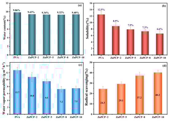 (a) The water contents, (b) water solubility and (c) water vapor permeability of PVA and ZnPCP films, together with (d) the antioxidant activity of ZnPCP.