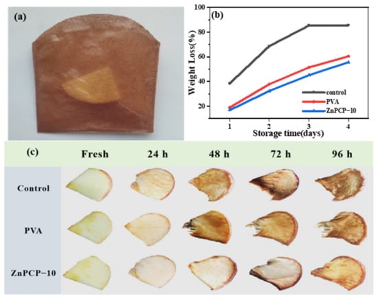 (a) ZnPCP−10 bag with apple slice; (b) weight loss and (c) fresh-keeping performance for bagged apple slices.