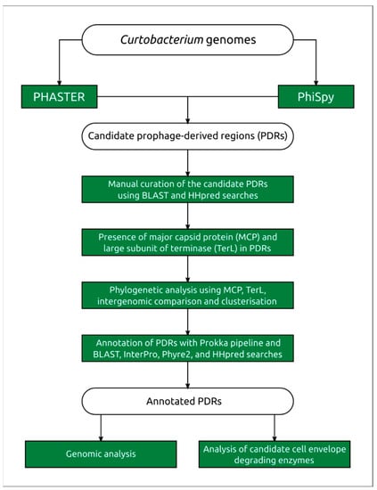Prophages can constitute as much as 10–20% of a bacterial genome and contribute to interstrain variability. Prophages may harbour virulence factors and pathogenicity islands, thereby playing an important role in the emergence of pathogens [24,25]. The purpose of the present study was to ascertain the repertoire, and possible role, of prophage sequences in the genomes of Curtobacterium sp., to propose the origin and phylogeny of initial phages, considering recent changes in bacteriophage taxonomy, and to reveal and systematise information about cytolytic enzymes encoded in prophage sequences which may have biotechnological potential.