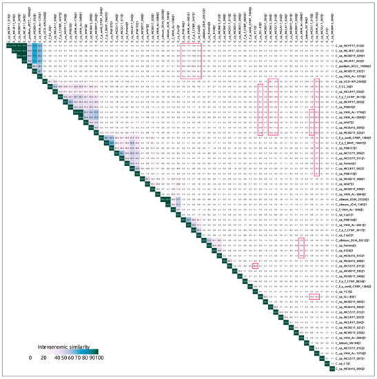 VIRIDIC-generated heatmap of 64 curated PRDs containing major capsid protein and terminase genes. The colour coding indicates the clustering of the phage genomes based on intergenomic similarity. The numbers represent the similarity values for each genome pair, rounded to the first decimal. Examples of heatmap islands indicating similarities between prophages not belonging to main clusters are outlined in red.