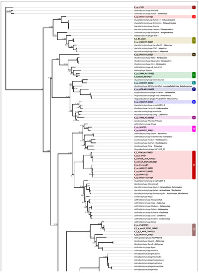 Phylogenetic analysis using amino acid sequences of conservative proteins can reveal more distant evolutionary and taxonomic relationships [59]. The list of related phage taxonomic groups exposed using the MCP and TerL phylogenies (Figure 4, Supplementary Figure S1) basically includes both unclassified and classified temperate actinophages of siphoviral morphology assigned to subfamily Nclasvirinae and several dozen genera not assigned to any subfamily or family, including Bridgettevirus, Britbratvirus, Bronvirus, Coralvirus, Decurrovirus, Fromanvirus, Mapvirus, Timquatrovirus, etc. The related phages infect bacteria belonging to genera Arthrobacter, Attisvirus, Bifidobacterium, Corynebacterium, Gordonia, Microbacterium, Mycobacterium, Streptomyces, Propionibacterium, Rathayibacter and Rhodococcus.