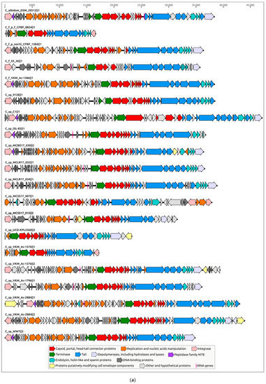 Genomic regions of all predicted prophages, not trimmed by contig limits, comprised all other functional modules featuring the tailed phages, including structural and lysis modules. All predicted major capsid proteins featured HK97 fold, typical for Heunggongvirae viruses, including tailed bacteriophages [49]. HHpred analysis indicated similarities among the analysed structural proteins and structural proteins of transposable phage Mu [50,51], including Mu F-like and Mu G-like putative capsid assembly proteins (Figure 5b). The lysis cassettes were predicted to encode a three-step lysis system [52] containing the endolysin, holin and spanin genes. The genomes of putative prophages assigned to clusters 1, 4–10, 12 and 17 can contain two adjacent membrane holin-like proteins, possibly possessing the holin–antiholin system, where antiholin controls the timing of host cell lysis by inhibiting holin [53,54]. Most PRDs’ genomes have genes encoding depolymerases of different functionality, as discussed below. They can be released during the lytic stage, facilitating phage escape [55].