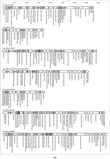 (a) Simplified genetic maps of the representatives of each putative prophage cluster shown in Figure 4. (b) Genetic maps of seven putative prophages predicted to be contained in Curtobacterium genomes of VKM collection strains. Arrows indicate the direction of transcription.