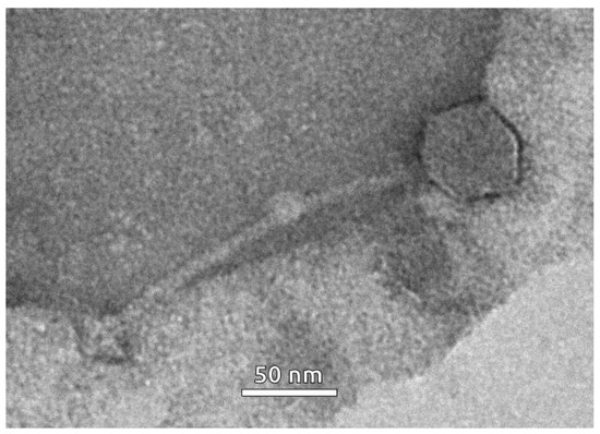 The siphoviral morphology of phage particles induced from the bacterial culture of the Curtobacterium strain VKM Ac-2884 was revealed using transmission electron microscopy (TEM) (Figure 6). The induced prophage was characterised with a flexible ~190-nm-long tail and an isometric capsid with a diameter of ~60 nm.
