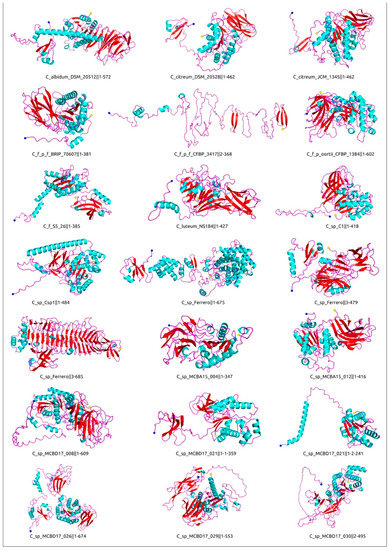 Phage endolysins encoded in predicted prophage-derived regions were represented by several groups showing different types of enzymatic activity, but most of the predicted lysins appeared to exhibit D,D-dipeptidase activity (Figure 11). Predicted structures of predicted endolysins were typical for Gram-positive bacteria, featuring a modular architecture that included at least two domains: catalytic domains and binding domains [106,107,108]. One endolysin, putative γ-D-glutamyl-L-diamino acid endopeptidases from C_sp_MCSS17_007‖1, was predicted to have a four-domain architecture, while another endolysin, putative GH25 family muramidase from C_sp_C1‖1, was modelled as a three-domain structure. Interestingly, regardless of the number of domains, the catalytic domain was located in the N-terminal part of all proteins. A pronounced modular architecture of endolysins, together with a high level of accuracy of structure predictions using modern AI software, might be used for the design of chimeric proteins that are effective against Curtobacterium infections.