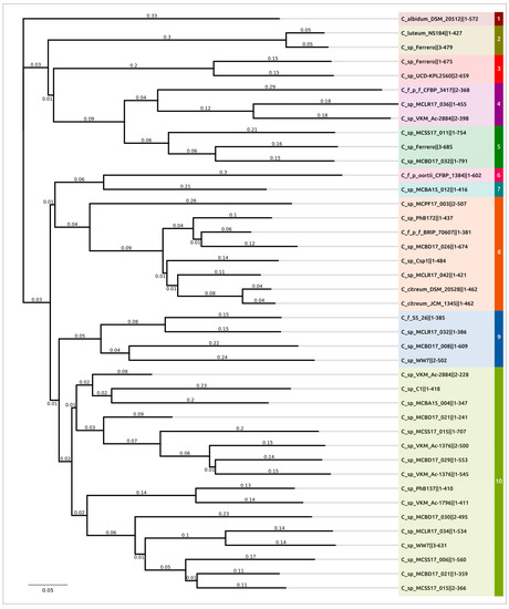- Letunic, I.; Bork, P. Interactive Tree Of Life (ITOL) v5: An Online Tool for Phylogenetic Tree Display and Annotation. Nucleic Acids Res. 2021, 49, W293–W296. [Google Scholar] [CrossRef] [PubMed]