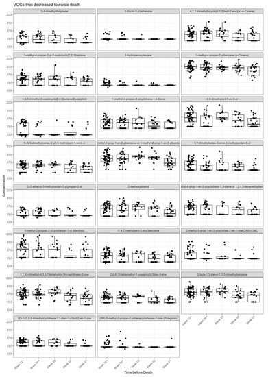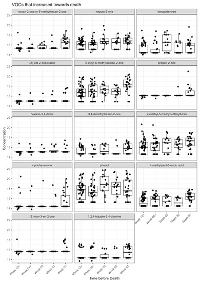 Visual inspection of the box plots, for each VOC, by week categories towards death showed 11 increased towards death (Figure 1), whereas 23 decreased towards death (Figure 2). A total of 3 VOCs in the acid dataset found to be significantly increased towards death did not have a clear trend towards death (Figure 1: benzaldehyde, 3,4-dimethylhexan-2-one and phenol: two of these had larger CV >40%).