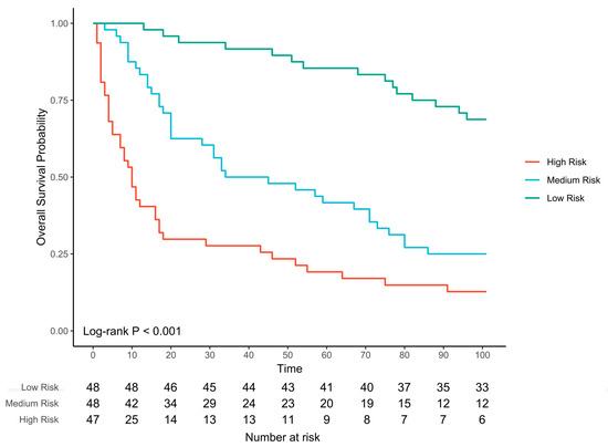 Kaplan–Meier survival curves using the Cox Lasso regression model. It shows three groupings based on prediction of 21-day risk, representing high, medium and low risk of dying.
