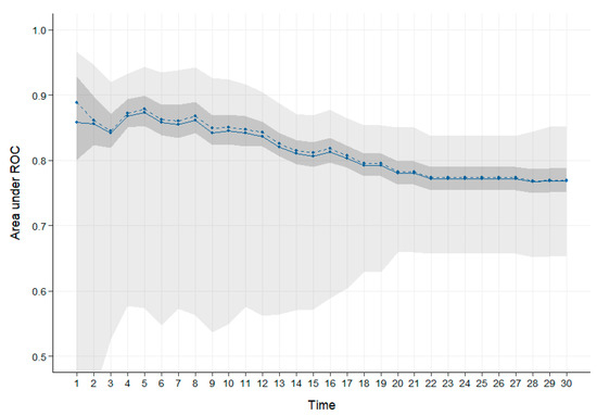 AUC for the Cox Lasso regression model. The blue line shows the mean and dotted line the median. The dark grey shows the confidence interval, and the light grey shows the minimum and maximum values.