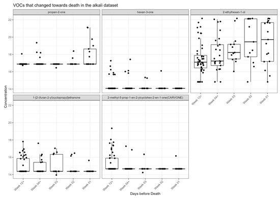 Visual inspection of the box plots of each VOC by week categories towards death showed two (alkali) increased towards death, whereas three decreased towards death (Figure 5).