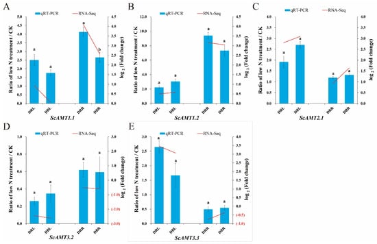 The expression patterns of the five AMT family DEGs between two sugarcane cultivars with contrastive NUE under low N condition. Notes: (A–E) represent the expression patterns of ScAMT1.1, ScAMT1.2, ScAMT2.1, ScAMT3.2, and ScAMT3.3, respectively. The expression patterns determined by qRT-PCR (the ratio of DEGs expression level between low N treatment and their control groups, Ratio of low N treatment/CK) and RNA-Seq (in log2 Fold change) are shown on the left and right sides in the same figure, respectively. DRL and DBL (RLT vs. RLCK, DRL. BLT vs. BLCK, DBL) mean the DEGs in the leaves of ROC22 and Badila under low N treatment (0.6 mM N) for 6 h vs. 0 h (used as control), respectively. DRR and DBR (RRT vs. RRCK, DRR. BRT vs. BRCK, DBR) mean the DEGs in the roots of ROC22 and Badila under low N treatment (0.6 mM N) for 3 h vs. 0 h (used as control), respectively. Error bars represent ± standard error from the mean of three biological replicates. Different letters above columns indicate significant differences (p < 0.05).