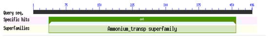 In the present study, a ScAMT1.1 gene was cloned from the sugarcane cultivar ROC22 (Supplementary Figure S1). Its full-length cDNA was 1868 bp, containing a 1491 bp open reading frame (ORF) and encoding 496 amino acids (Supplementary Figure S2). A conservative AMT1.1 domain, belonging to the AMT superfamily, was located at the middle region (from 36th to 459th amino acid residues) of the ScAMT1.1 protein sequence (Figure 2). The theoretical molecular weight of the ScAMT1.1 protein was 124.47 kDa, which belongs to the acidic hydrophobic protein and contains transmembrane domains with the greatest probability of localization in the plasma membrane.