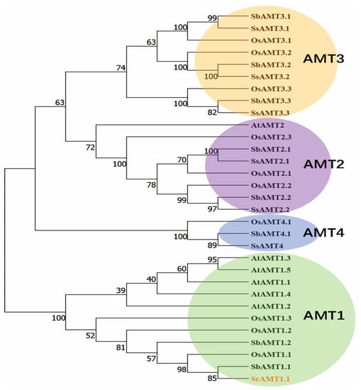 Phylogenetic relationship of sugarcane ScAMT1.1 protein and AMTs from S. spontaneum, A. thaliana, O. sativa, and S. bicolor.