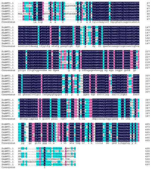 Sequence alignment of ScAMT1.1 and AMT1.1s from other species. Notes: S. bicolor (SbAMT1.1, AGK25010.1), Z. mays (ZmAMT1.1, NP_001140828.1), O. sativa (OsAMT1.1, Q7XQ12.1), T.aestivum (TaAMT1.1, AAS19466.2), G. max (GmAMT1.1, XP_003555734.1), and A. thaliana (AtAMT1.1, EFH51425.1).