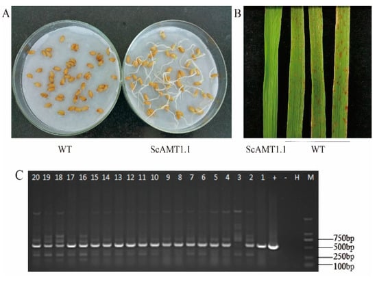 Identification of transgenic-positive rice plants. Notes: (A), The seeds germinate during soaking with 0.1% Basta solution. (B), The typical phenotype of the leaves spraying with 0.2% Basta solution. (C), Analysis of PCR amplification products by gel electrophoresis. WT: wild-type; ScAMT1.1: ScAMT1.1-overexpressing transgenic rice. M: 2000 bp DNA marker; H: H2O (blank control); -: negative control (wild-type rice); +: positive control (pBWA(V)BU-ScAMT1.1 plasmid), 1–20: different transgenic rice lines. The PCR product for the target sequence is 512 base pairs.