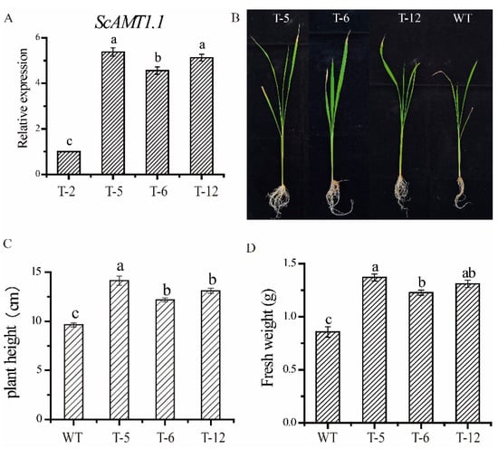 Four homozygous T3 generation transgenic lines (T-2, T-5, T-6, and T-12) were obtained according to the methods described in 4.4. Compared to the other transgenic lines, higher ScAMT1.1 expression levels in the transgenic lines of T-5, T-6, and T-12 were found by qRT-PCR (Figure 6A), and thus they were used to investigate the agronomic traits in the following assay. The transgenic lines showed a better performance than the wild-type plants under low N stress. After culturing for 16 d under low N nutrient solution, transgenic rice seedlings of T-5, T-6, and T-12 grew significantly better than the wild-type (Figure 6B), and their plant height was 46.83%, 26.58%, and 36.03% higher than that of the wild-type (Figure 6C), respectively. In addition, their fresh weight was 59.30%, 43.02%, and 52.33% higher than that of the wild-type, respectively (Figure 6D).
