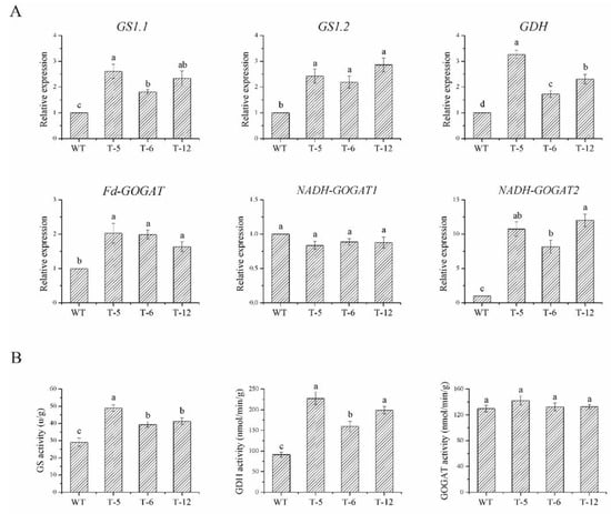 The gene expression levels and enzyme activities of ammonium assimilation-related enzymes in the transgenic rice under low N stress. Notes: (A), The expression levels of ammonium assimilation-related enzyme genes in the transgenic rice under low N stress. (B), The activities of three ammonium assimilation-related enzymes in the transgenic rice under low N stress. WT: wild-type. T-5, T-6, T-12: different transgenic lines. Data were presented as the mean ± standard error (n = 3). Bars with different letters were significantly different at the p < 0.05 level.