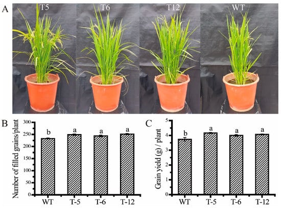 Phenotype and yield components of the transgenic rice in the pot experiment under low N stress. Notes: (A), The phenotype of the transgenic rice at the late filling stage under low N stress. (B,C), The number of filled grains and grain yield per plant of the transgenic rice under low N stress, respectively. WT: wild-type. T-5, T-6, and T-12: different transgenic lines. Data were presented as the mean ± standard error (n = 3). Bars with different letters were significantly different at the p < 0.05 level.