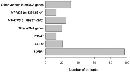 Analyzing the clinical features of the entire population that participated in our study we found that, regardless of the molecular cause, the most common and initial symptoms of the disease are psychomotor retardation or regression of skills and muscle hypotonia/weakness. At the same time, there are differences in the age of manifestation: the average age of manifestation in pathogenic variants in the SCO2 gene is 4 months, while for variants in mtDNA, manifestation is typical at a later age—20 months. Typically, the age of onset in patients with the SURF1 gene mutations ranges from 3 to 6 months [5], but in our series, the average age of the manifestation is 16 months. The major clinical presentation of SURF1-associated Leigh syndrome is cerebellar signs such as ataxia (40.6%). Ataxia is also a common symptom in PDHA1 variants (70.0%). Pyramidal symptoms in the form of spastic paraplegia/tetraparesis are more typical for patients with mtDNA variants (54.0%) than the SURF1 gene cases (9.4%). Although spasticity in SURF1 appears in the later period of the disease, in cases of mtDNA variants, it was observed at early stages in some patients. Epilepsy, as another neurological sign, was observed in 31.6% (12/38) of patients with mtDNA variants and only in 9.4% (2/32) of the SURF1 gene patients. This is consistent with the literature data, since epilepsy is not a characteristic symptom for SURF1 patients, while it is common for mtDNA mutations [12].