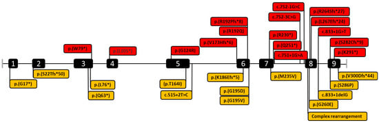 Among 16 novel identified variants, there are 6 missense substitutions c.491C>T (p.Thr164Ile), c.584G>A (p.Gly195Asp), c.856T>C (p.Ser286Pro), p.584G>T (p.Gly195Val), c.779G>A (p.Gly260Glu), c.703A>G (p.Met235Val), 3 nonsense variants c.49G>T (p.Gly17Ter), c.187C>T (p.Gln63Ter), c.227T>A (p.Leu76Ter), 3 frameshift c.554_555insA (p.Lys186GlufsTer5), c.65del (p.Ser22ThrfsTer50), c.899_902del (p.Val300AspfsTer44), 2 splicing variants (c.515+2T>C, c.833+1del) and 2 complex rearrangements.