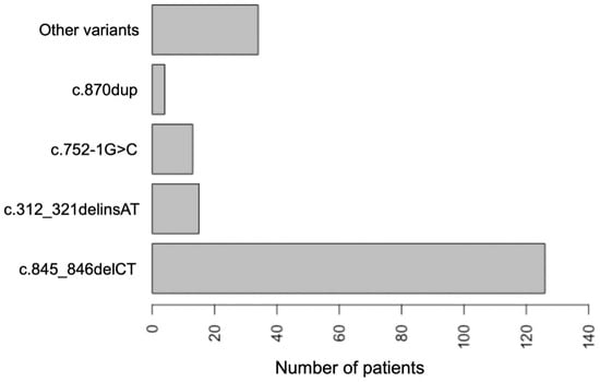 Molecular genetic studies were performed in all 97 patients. Variants in the SURF1 gene (OMIM* 185620; NM_003172.4) are frequent cause of LS in patients from Russia; this gene accounts for 44.3% of all cases (Figure 1). 32 different nucleotide variants were detected on 194 alleles from 97 unrelated families, including 14 new variants and 2 complex pathogenic variants (Figure 2). Among 32 variants: 8/32 (25.0%) were missense, 8/32 (25.0%) nonsense, 8/32 (25.0%) frameshift, 6/32 (18,8%) splicing and 2/32 (6.25%) complex rearrangements. The c.845_846delCT (p.Ser282CysfsTer9) was the most common variant with an allelic frequency of 66.0% (128/192); c.312_321delinsAT (p.Leu105Ter)—7.7% (15/194); c.752-1G>C—6.7% (13/194); c.870dup (p.Lys291Ter)—2.1% (4/194) and other variants—17.5% (34/194) (Figure 3). In 38 (39.2%) patients, the variant c.845_846delCT was detected in homozygous state and in 50 (51.5%) patients in compound heterozygous state.