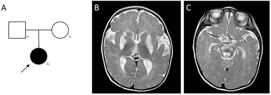Patient 1 with LS caused by pathogenic variants in the MORC2 gene. (A)—Pedigree of patient 1. MRI images of the brain; (B)—bilateral of hyperintensity on T2W mode in the putamen; (C)—changes in the pontine tegmentum.