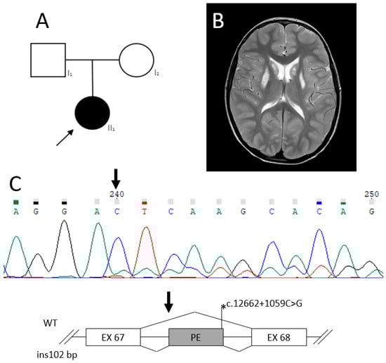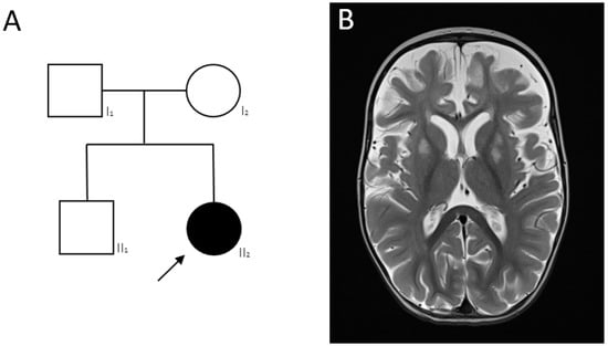 Patient 2, girl, 10 m. old. The second child in this family, the elder sibling is 6 years old, healthy (Figure 5A). At the age of 3.5 months, she was consulted with delayed psychomotor and pre-speech development, dystonic muscle tone, with elements of hypertension in the distal extremities, hypotension in the adductor muscles of the neck, oculomotor disorders (horizontal nystagmus).