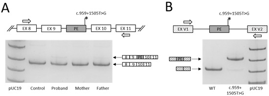 The results of mRNA analysis for the c.959+1505T>G variant. (A)—Analysis of mRNA from patient’s fibroblasts. Visualization of PCR products by PAGE. (B)—Results of the minigene assay. Visualization of plasmid-specific PCR products by PAGE. PE—pseudoexon, EX V1 and EX V2—constitutively spliced exons of the pSpl3-Flu2-mTK vector, gray arrows—location of PCR primers. pUC19—DNA ladder.