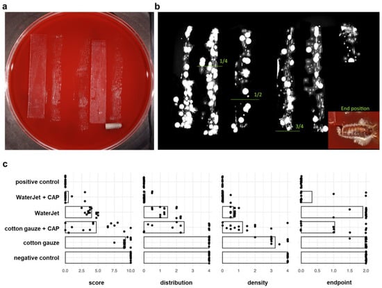 Implants were placed on Columbia Agar with 5% sheep blood (Becton Dickinson, Heidelberg, Germany). With sterile medical gloves (Semperit, Vienna, Austria), the implant was rolled for 30 cm on the agar along glassware tracks and two agar plates per sample. Considering the implant radius and the entire rolling distance, the procedure correlated to 30 implant turns (Figure 2a). The implant was left at its end position for incubation. The agar plates were incubated for 72 h at 37 °C. This technique was adapted from Koch et al. []. For data analyses, images of each agar plate were acquired using a digital camera (Canon EOS 450D, Macro lens EF-S 60 mm 1:2.8; Canon, Krefeld, Germany). The images show the distribution and density of grown colonies along the roll-out line (Figure 2b). To evaluate the data, an evaluation system was defined containing three single scores: (i) distribution of colonies and (ii) density of grown colonies along the roll-out line, and iii) growth of colonies at the final position where the implant was left, with categories ranging from value 0 to 4 (i and ii) or from 0 to 2 (iii). The categories are (i) no colonies from start to end (0), sporadic colonies and no distribution gradient (0.5), colonies only in the first quarter (1), colonies in the first and second quarter (2), colonies until the third quarter (3), colonies in all quarters along the roll-out line (4); (ii) no colonies (0), sparsely sporadic colonies (0.5), sporadic colonies (1), predominantly single colonies (2), dense colonies with sparsely single colonies (3), dense colony layer (4); (iii) no colonies (0), 1 to 3 colonies (1), dense colony cluster (2). The score outcomes were determined by two individuals independently. Every single score and the sum of the three scores (combined score) was used for statistical analysis. Each treatment modality (four test groups and two controls) was performed with a total of 15 implants with 4 runs.
