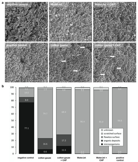 Implant SEM analysis. (a) scanning electron micrographs of implant surfaces of untreated samples (negative control), samples treated by WaterJet, cotton gauze, CAP, and sterilized samples (positive control), with white arrows indicating remaining microorganisms; (b) percentages of cross points with microorganisms, organic deposits, flawless surface, scratched surface, and unknown among all treatment conditions. Scale bar = 1 µm; white arrowheads show single bacteria.
