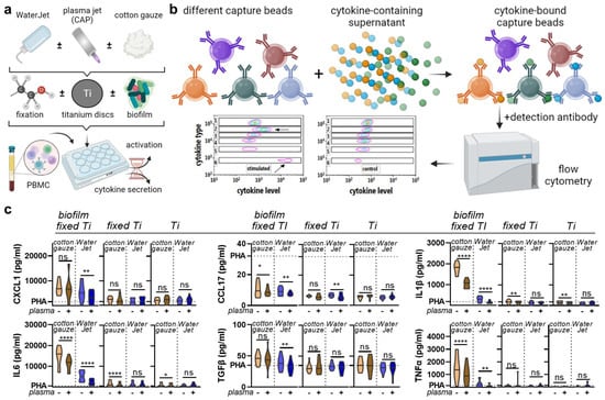 Chemokine and cytokine analysis. (a) sampling scheme; (b) overview of multiplex assay used in this study; (c) absolute analyte concentrations across cotton gauze and WaterJet ±CAP conditions and PHA (dotted line) as reference of leukocyte culture supernatants incubated with contaminated titanium discs (biofilm fixed TI), clean titanium discs exposed to fixative only (fixed Ti), and titanium discs only (no fixation). Principal component analysis across treatments and titanium disc conditions. Data are from four donors and show violin plots and median (c). Statistical analysis was performed using paired t-test; * = p < 0.05, ** = p < 0.01, **** = p < 0.0001, ns = not significant. PBMC from four different donors were tested. Biofilm was generated from subgingival plaque of a single periodontally diseased individual.