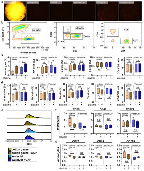 After mapping the secretion profiles of human leukocytes in contact with the differently treated titanium surfaces, we were interested in analysing the responses of the cells in contact with such surfaces. After all, a novel combination treatment should have not only high efficacy but also good tolerability and should lack immuno-sensitisation. The titanium discs were treated as before, and acridine orange was used to visualise the remaining biofilm (Figure 5a). PBMC from four different donors were cultured on these biofilm discs, which were fixed after treatment to allow non-contaminated co-culture with PBMC, and harvested 24 h later. The cells were stained for several surface markers and gated for several leukocyte subpopulations (Figure 5b). When analysing the percentages of cell populations, cotton gauze + CAP and WaterJet + CAP treatment gave a significant increase of monocytes relative to all leukocytes (Figure 5c). In PBMC cultured with gauze + CAP and WaterJet + CAP-treated and subsequently fixed titanium discs, tendencies were similar for all sub-populations (Figure 5d). Next, all subpopulations were analysed for the late activation marker CD25 (Figure 5e), the early activation marker CD69, and the activation as well as exhaustion marker and immune-checkpoint PD1 (CD279) (Figure A4). Cotton gauze and WaterJet with or without CAP conditions were normalised to biofilm-removal positive control data. CAP + cotton gauze treatment significantly reduced CD25 in monocyte cultured on contaminated (Figure 5e) and clean, fixed titanium discs (Figure 5f). Interestingly, changes in monocyte numbers (Figure A5a) or CD25 (Figure A5b) expression could not be observed in PBMC cultured on cotton gauze and WaterJet with or without CAP treated, unfixed titanium samples. For CD69 and CD279 significant changes could not be observed in any cell type or treatment condition (Figure 5f,g and Figure A5b) except for a small but significant decrease of CD69 in CD8+ cytotoxic T lymphocytes cultured on cotton gauze + CAP-treated, unfixed titanium discs (Figure A4b). Regarding the monocyte data on contaminated discs, these data suggested CAP to add to the inherently deficient biofilm removal by cotton gauze, as biofilm-derived microbe-associated molecular patterns active monocytes. In addition, these data indicate that CAP treatment to not induce overshooting inflammatory cellular reactions when combined with WaterJet or cotton gauze for biofilm removal. In sum, titanium CAP treatment does not promote non-specific leukocyte activation marker expression.