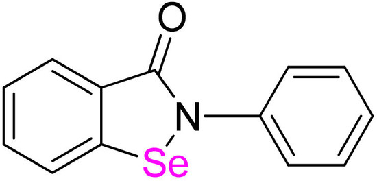 The antibacterial properties of ebselen were originally verified by Nozawa et al. with a series of Gram-negative and Gram-positive clinical isolates resistant to methicillin, a narrow-spectrum β-lactam antibiotic of the penicillin class [10]. In general, ebselen was found to be active or moderately active in Gram-positive bacteria and poorly active in Gram-negative strains. Consequently, the growth of strains of Staphylococcus aureus and Staphylococcus epidermidis were inhibited at a concentration of 0.20 µg/mL and the streptococcal species at 1.56–6.25 µg/mL, while members of the Enterobacteriaceae family were more resistant (12.5–50 µg/mL). The presence of the selenium atom was shown to be essential for the antibacterial activity because the corresponding sulfur analog lost the potency of the organoselenium counterpart. The authors correlated the ebselen/ebsulfur potency ratio with their antioxidant properties, which were principally relevant to the chemical reactivity with sulfur nucleophiles.