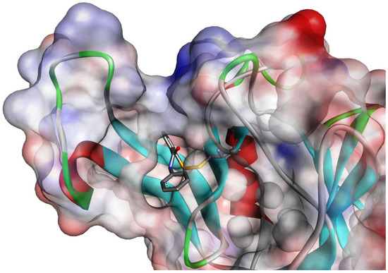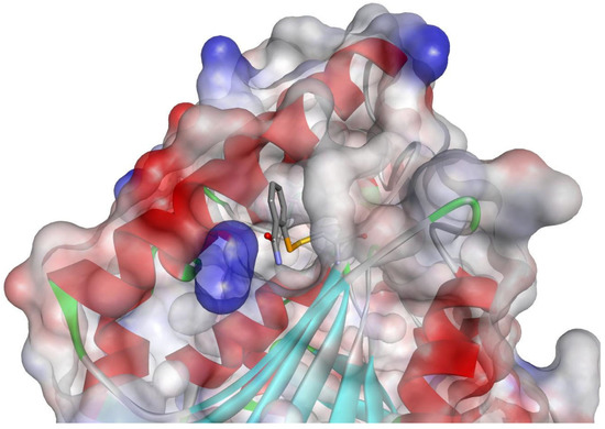 Binding mode of ebselen with antigen 85C (Protein Data Bank (PDB): 4QDU). The inhibitor reacted with C209 is shown as sticks, while the enzyme is shown as a ribbon. The surface of the protein is colored according to the charge.