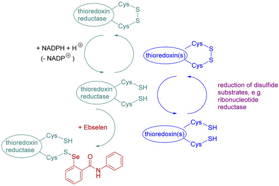 The mechanism of antibiotic action and the molecular target of ebselen were broadly illustrated by the work of Holmgren’s group. Studies have shown that this compound potently inhibits Escherichia coli thioredoxin reductase (Ki = 0.52 µM) with a competitive and reversible mode of action [21]. Using NADPH, the flavoprotein thioredoxin reductase recycles thioredoxin, a disulfide oxidoreductase, within the system, which catalyzes the reduction of oxidized cysteine and the cleavage of disulfide bonds in multiple substrates (Scheme 1) and thus plays a fundamental role in processes, such as defense against oxidative stress and DNA synthesis [22]. As thiol redox homeostasis is critical for cell viability and proliferation, many pathogenic bacteria lacking support with the glutathione reductase/glutaredoxin system (in general Gram-positive bacteria, for example, S. aureus and M. tuberculosis, but with certain exceptions, for example, H. pylori) are sensitive to the inhibition of thioredoxin reductase [23]. Inhibition causes the accumulation of oxidized thioredoxins, alters the reductions of cellular disulfides, increases oxidative stress, and ultimately leads to cell death. Accordingly, ebselen exhibited a significant effect on drug-resistant strains of H. pylori and M. tuberculosis, with MIC/MBC (minimum bactericidal concentrations) in the range of 3.13–20 µg/mL [21]. Taking into account the molecular mode of binding, it was hypothesized that the organoselenium compound formed a covalent S–Se bond by opening the ring with thiolate of one of the cysteines of the Cys-Pro-Gly-Cys active site motif (Cys-Xaa-Xaa-Cys, in general, Scheme 1). The transient complex was trapped by reaction with 14C-radiolabeled ebselen, indicating Cys135 as the selenation position.