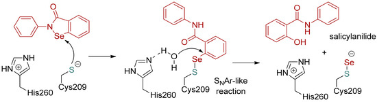 The proposed mechanism of selenation of a cysteine residue and aging of the preliminary adduct, including the opening of the ebselen isoselenazolone ring and the hydrolytic release of salicylamide, adapted to antigen 85C based on the structure of SARS-CoV-2 Mpro [49].