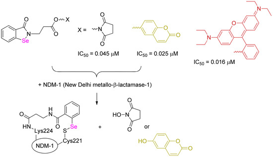 This structural scaffold was also used to construct advanced derivatives, potent and specific covalent inhibitors, or fluorescent probes of NDM-1 and related lactamases. Succinimide and coumarin-based esters were supposed to act by dually modifying Cys221 by selenation and Lys224 via acylation, with the latter associated with the release of the florescent portion (Scheme 3) [59]. The use of rhodamine B led to the compound that labeled the single site (Cys221).
