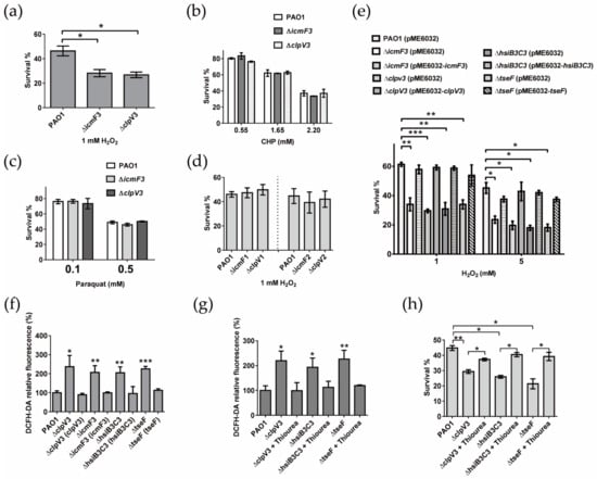 In addition, thiourea, as an effective hydroxyl radical scavenger, can directly quench the hydroxyl radical produced by the Fenton/Haber-Weiss reaction [38,39]. Thiourea treatment could effectively reduce the intracellular ROS level of H3-T6SS mutants under H2O2 stress (Figure 2g) and could significantly increase the survival rate of H3-T6SS mutants under H2O2 stress (Figure 2h). These results further confirm that H3-T6SS is involved in the elimination of intracellular ROS in P. aeruginosa.