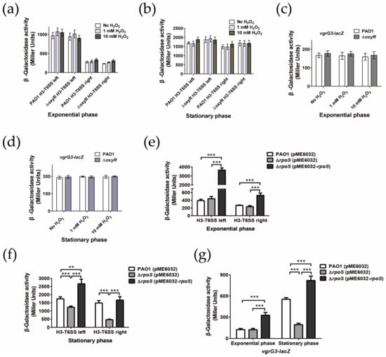 Expression of H3-T6SS is positively regulated by RpoS but not by OxyR. (a–d) β-Galactosidase analysis of the H3-T6SS promoter activity using the transcriptional H3-T6SS-left-lacZ, H3-T6SS-right-lacZ, and vgrG3-lacZ chromosomal fusion reporters expressed in the wild-type and ΔoxyR mutant strains. The H3-T6SS and vgrG3 expressions were monitored by collecting samples exposed to the indicated concentrations of H2O2 for 1 h in the logarithmic and stationary growth phases. The graph shows the mean and SD of three experiments performed in five replicates each time. (e–g) Expression of the H3-T6SS-lacZ and vgrG3-lacZ transcriptional fusion reporters from the PAO1 strain, its isogenic rpoS mutant, and the complementary strain ΔrpoS (pME6032-rpoS). The growth and β-galactosidase activity were monitored by collecting samples in the logarithmic or stationary growth phase. The graph shows the mean and SD of three experiments performed in five replicates each time. ** denotes p < 0.01, and *** denotes p < 0.001.