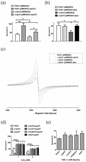 Alkyl peroxidase gene cluster ahpCF and DNA binding stress protein gene dps were overexpressed in the WT PAO1 and ΔclpV3, respectively, verifying the proteome results. Under 1 mM H2O2 stress, the survival rate of ΔclpV3 (pME6032) was significantly lower than that of strain PAO1 (pME6032). However, the survival rate of the ΔclpV3 strain after the introduction of pME6032-ahpCF was higher than that of the PAO1 (pME6032) strain, but was still significantly lower than that of the PAO1 (pME6032-ahpCF) strain (Figure 4a), indicating that overexpression of ahpCF could not restore the sensitive phenotype of the ΔclpV3 strain to H2O2. Under the same conditions, overexpression of the dps gene in the ΔclpV3 strain could effectively restore the survival rate of the ΔclpV3 strain to the level of the WT PAO1, which also overexpressed the dps gene (Figure 4b). These results suggest that the sensitive phenotype of the ΔclpV3 strain to H2O2 was directly related to the decrease in the intracellular Dps protein.